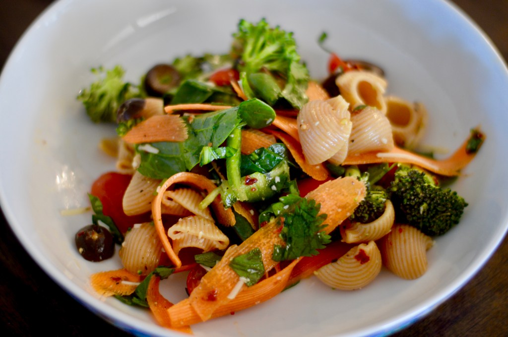 Boil the pasta ahead of time and cook it for the allotted time. While the pasta is cooling, cut up the rest of the vegetables and throw everything together afterwards, and give it a good mix. Then, voila!